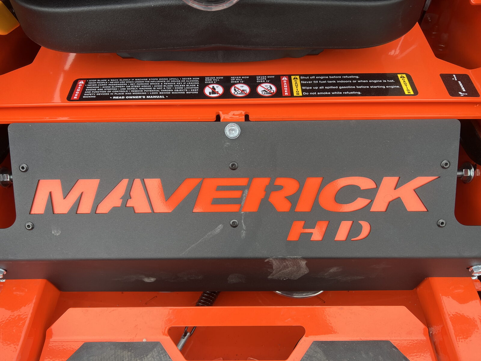 AMERICAN MADE TOUGHNESS: The Maverick HD Zero-Turn Mower is proudly built in the USA at our Arkansas headquarters. It's built around a heavy-gauge, all-steel, all-welded and fabricated 2" x 2" frame rail. The solid steel, 7-gauge formed and welded deck with reinforced 3/8" sides features a deeper 5.5” shell and an improved baffling system for greater grass lifting power and an even cleaner cut. Patented Dual Deck Support Isolators helps minimize damage from side impacts. And all of this strength is packed on a lower profile frame, which helps to improve your stability on inclines and uneven turf. The Maverick HD is ready for commercial duty.