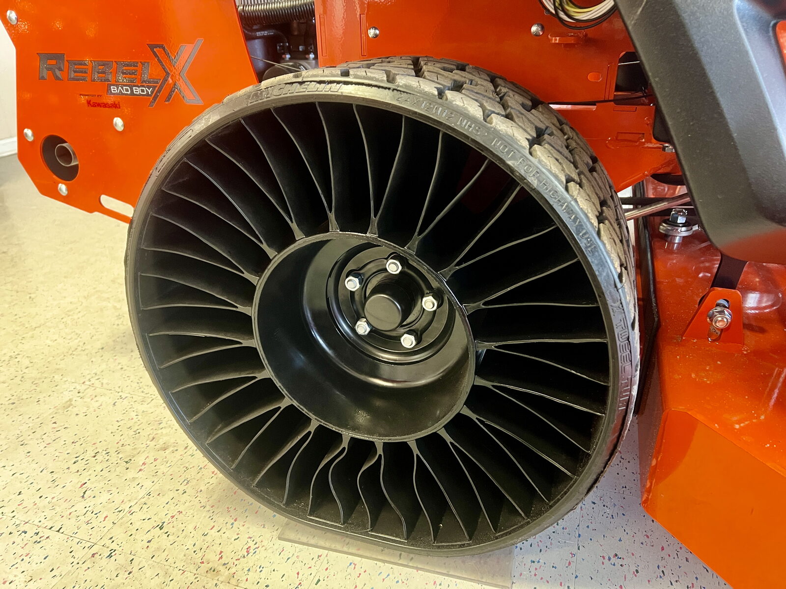 REBEL UPGRADES: If speed is what you need, you're going to love the Rebel X Zero-Turn Mower. Our newest addition to the Bad Boy line-up has been equipped with 5400 transaxles. They're faster and more robust, so you can take full advantage of any of our powerful engine choices. And you'll be rolling on Michelin® Tweels rear tires with renowned run-flat technology. These tires come with a revolutionary rear tread pattern that grips like a glove, so you can confidently mow any terrain. This mower also includes a striping kit, new floorboard mat, square drive arms and grips, plus a standard deck step. If you want to mow with an attitude, these innovations continue to change the game.